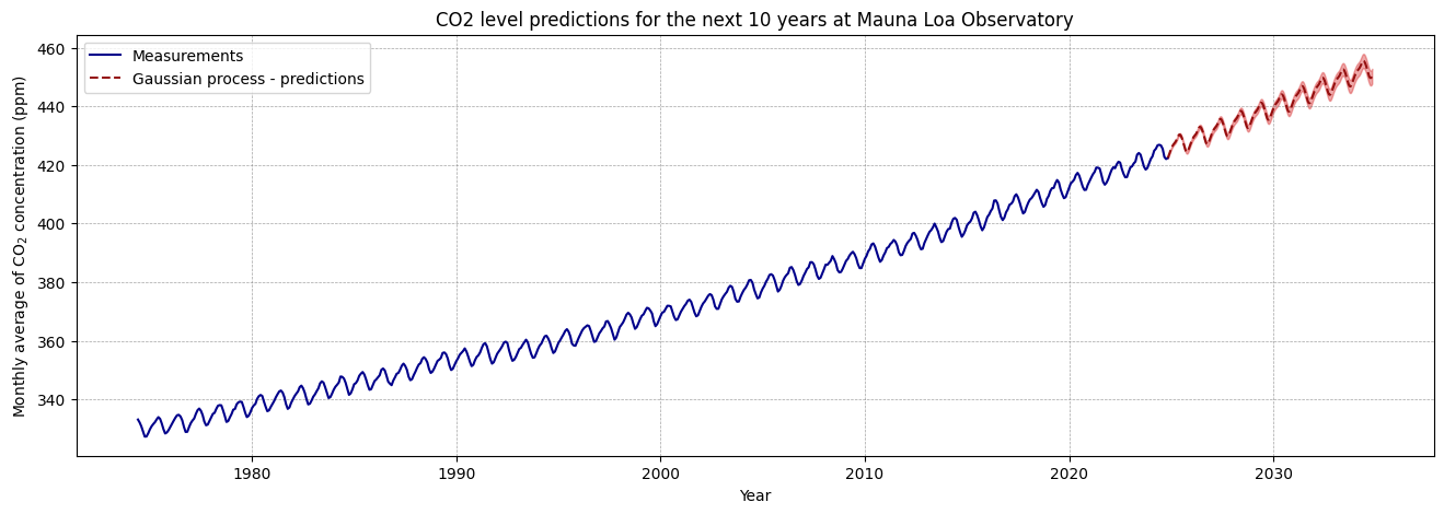 plt.figure(figsize=(16, 5))plt.plot(X, y, color="darkblue", linestyle="-", label="Measurements")plt.plot(X_test, mean_y_pred, linestyle="dashed", color="darkred", alpha=0.9, label="Gaussian process - predictions")plt.fill_between( X_test.ravel(), mean_y_pred - std_y_pred, mean_y_pred + std_y_pred, color="tab:red", alpha=0.4,)plt.grid( color="gray", linestyle="--", linewidth=0.5, alpha=0.7)plt.legend()plt.xlabel("Year")plt.ylabel("Monthly average of CO$_2$ concentration (ppm)")_ = plt.title("CO2 level predictions for the next 10 years at Mauna Loa Observatory")