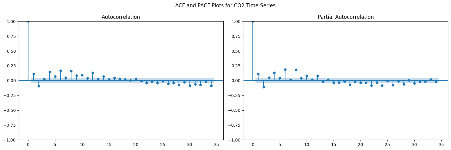 # Step 2: ACF and PACF for diagnosticsfig, (ax1, ax2) = plt.subplots(1, 2, figsize=(15, 5))plot_acf(co2_diff, ax=ax1)plot_pacf(co2_diff, ax=ax2)plt.suptitle('ACF and PACF Plots for CO2 Time Series')plt.tight_layout()plt.show()