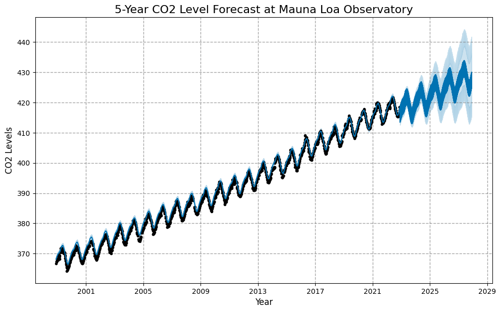 # Step 5. Visualize the Forecastplt.figure(figsize=(16, 8))fig = model.plot(forecast)plt.title('5-Year CO2 Level Forecast at Mauna Loa Observatory', fontsize=16)plt.xlabel('Year', fontsize=12)plt.ylabel('CO2 Levels', fontsize=12)plt.grid(True, linestyle='--', alpha=0.7)plt.show()