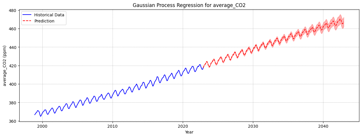 # Step 6. Make predictions# Calculating the last timestamp in your data as "year + fractional month"last_timestamp = df_CO2_monthly["datetime"].max()last_year_fractional = last_timestamp.year + last_timestamp.month /12X_test = np.linspace(start=last_year_fractional, stop=last_year_fractional +10, num=1_000).reshape(-1, 1)# Making the predictionsmean_y_pred, std_y_pred = gaussian_process.predict(X_test, return_std=True)mean_y_pred += y_mean